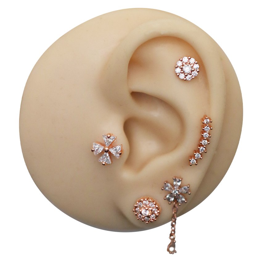 Dört Zirkon Taşlı Cross Figürlü 6x1,2 mm Rose Çelik Piercing, Helix-Kıkırdak-Conch-Lobe-Tragus