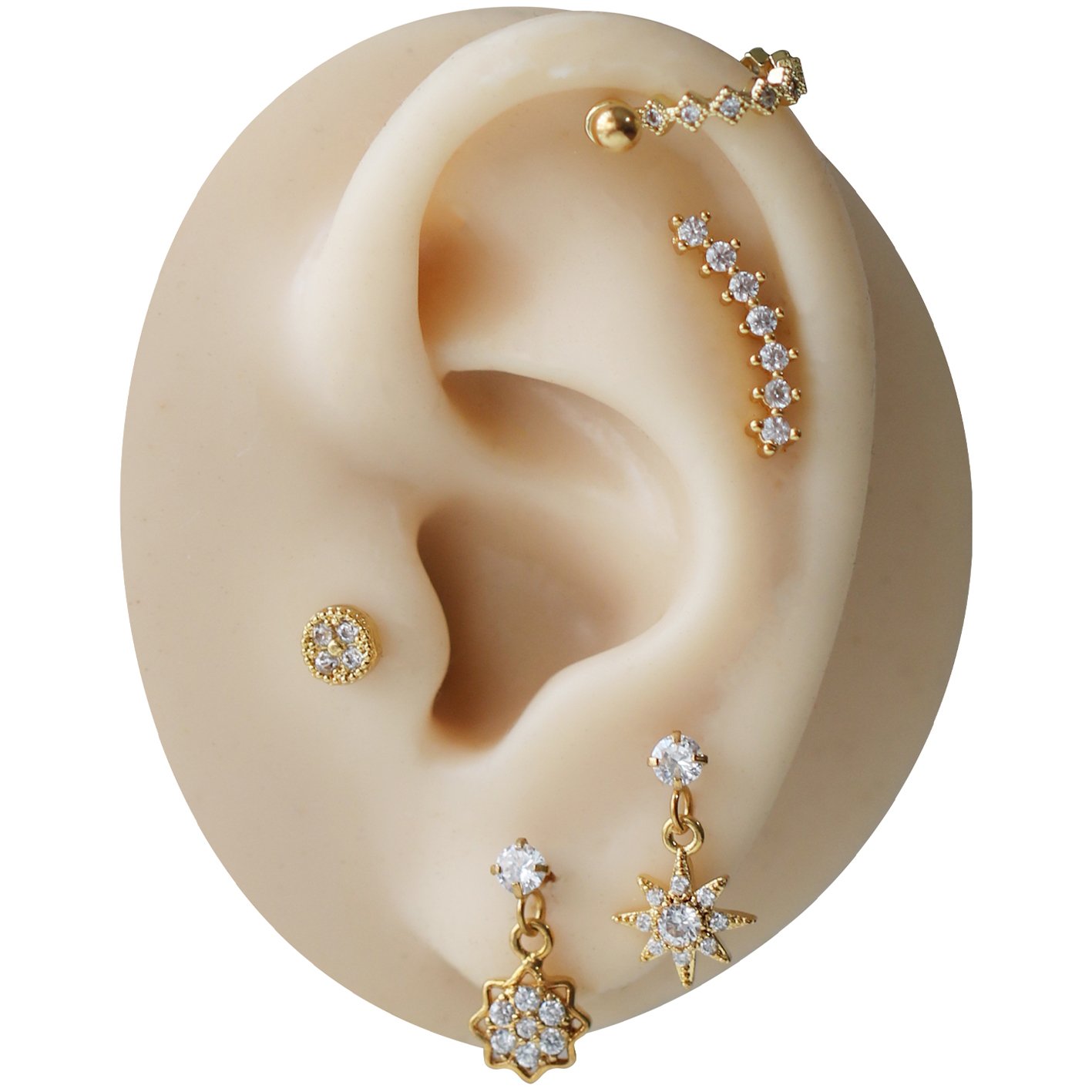 Gold kaplama yuvarlak tasarımı ve parlak zirkon taşlarıyla bu flatback piercing, hem günlük kombinlerinizde zarif bir dokunuş hem de özel anlarınızda göz alıcı bir detay sunar.